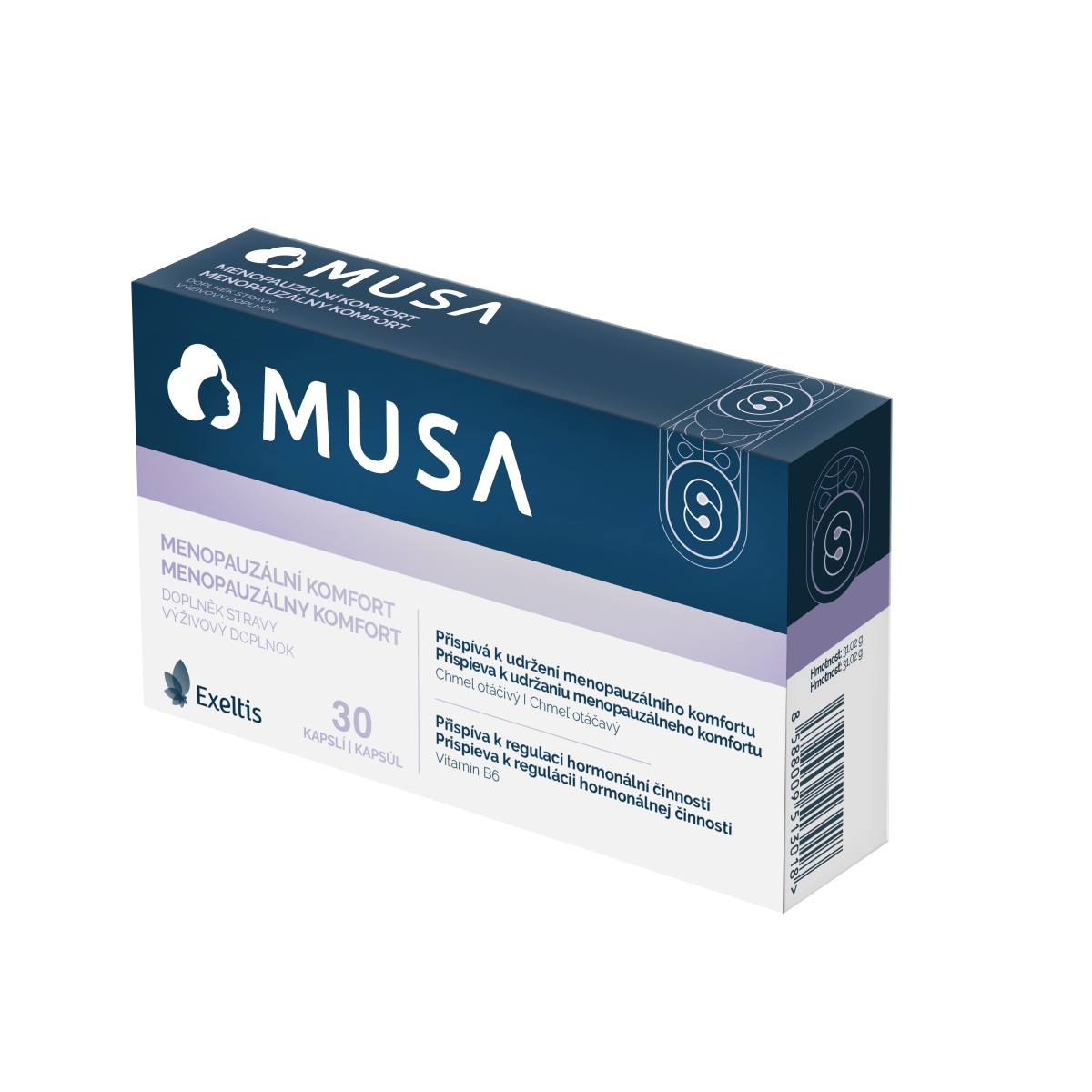 MUSA MENOPAUZÁLNÍ KOMFORT je doplněk stravy, který přispívá k udržení komfortu během menopauzy díky chmelu otáčivému a k normální hormonální činnosti díky vitaminu B6.